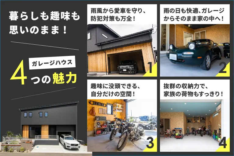 クルマやバイクを眺めながらくつろげる空間に、自分の時間を持てる余裕をプラス。家族の暮らしと、あなたの“好き”が両立できる新しい住まいです。