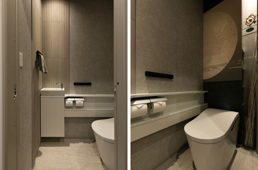 また、トイレの背面壁をのぞきこむと、トイレットペーパーのストックを収納できる棚を設けており、見た目をすっきりさせながら実用性にも配慮いたしました。