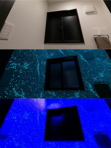 壁・天井の壁紙を天体が浮かび上がる蓄光クロスで遊びました。