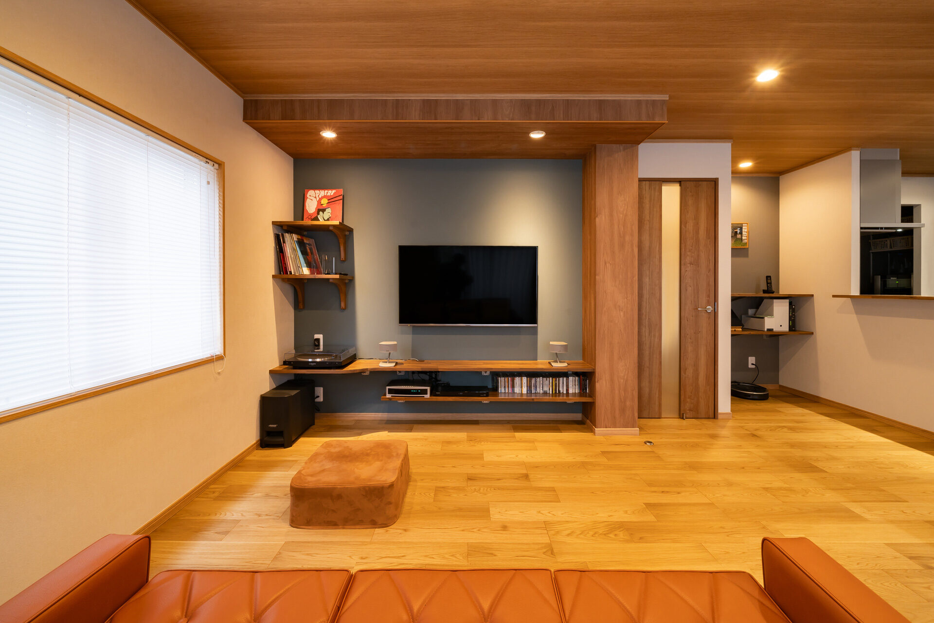 壁掛TVやレコード用の棚、スピーカー配置なども決めながら、